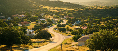 Cinematic aerial view of a winding country road through lush green hills and tranquil homes