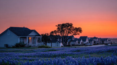 Sunset over lupine field with homes in the background.