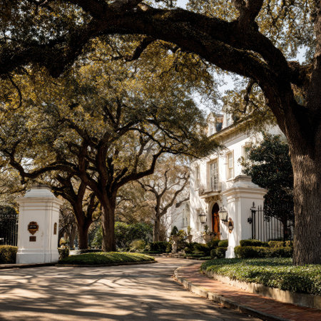 A stately mansion's entrance is framed by expansive, leafy trees. Sunlight filters through the foliage, creating dynamic shadows on the pathway. The architectural details of the building are prominent. This image might be suitable for editorial features or commercial projects related to real estate or luxury lifestyles.