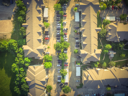 Vintage tone aerial view of apartment garage with full of covered parking, cars and green trees of multi-floor residential building at sunset in US.