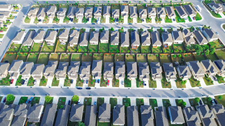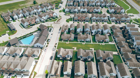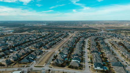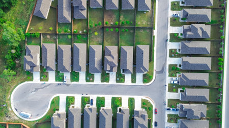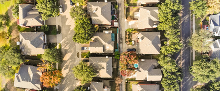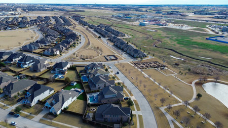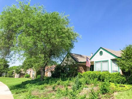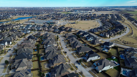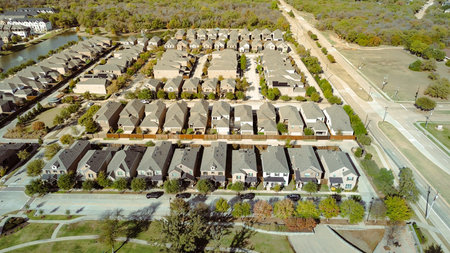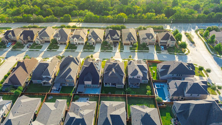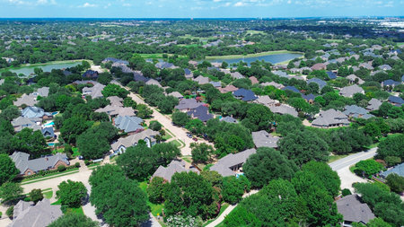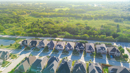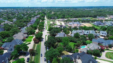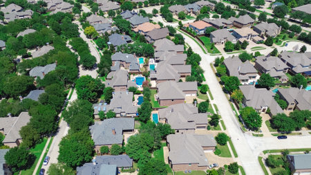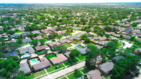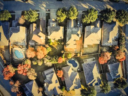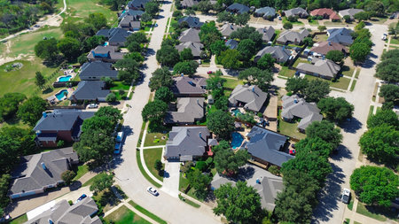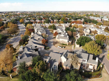 Bird eye view clean and peaceful neighborhood streets with row of single family homes near Dallas, Texas, USA