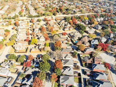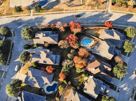 Vibrant urban forest park side residential community in Coppell, suburbs Dallas, Texas, colorful fall foliage autumn leaves, cluster of two-story houses with swimming pool, large backyard, aerial. USA