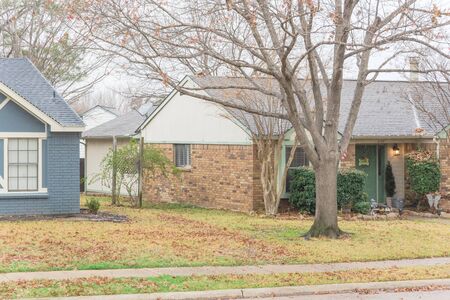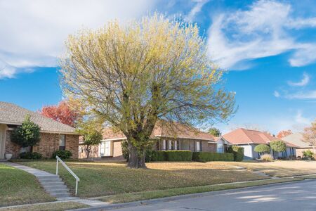 Typical bungalow style house in Dallas, Texas suburbs during fall season with colorful autumn leaves. Middle class neighborhood with single story residential home with mature tree, cloud blue sky