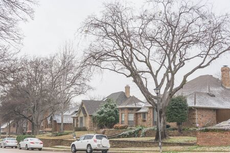 Typical residential street with bungalow houses under winter snow cover near Dallas, Texas. Middle class neighborhood in America.