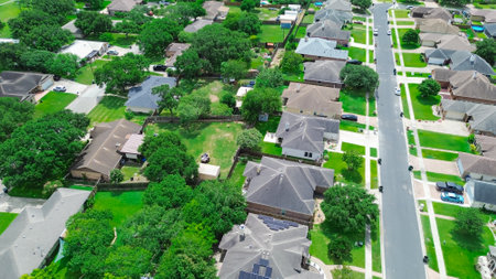 Peaceful residential street along row of single-family house with shingle, solar panel roofings in Calallen, Nueces County, Corpus Christi, middle income home trees in Southern Texas, aerial view. USA