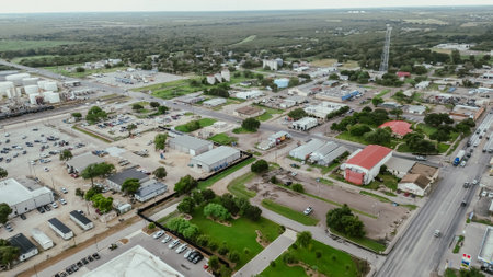 Cracking refinery facility, storage tanks and industrial buildings near downtown Three Rivers, US highway 281, Texas, small town mixed of oil gas industry and farmland, ranch, rural scene, aerial. USA