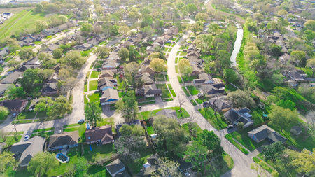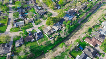 Suburban residential houses single family homes with swimming pool, well-trimmed landscape in Greater Inwood northwest part of Houston, Texas, grass lined drainage channel, early light, aerial. USA