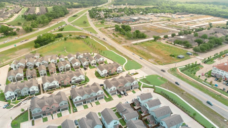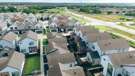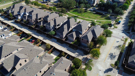Aerial view large two story houses with small front yard and backyard in North Texas, America. New development neighborhood with single roofs townhome with parked cars on narrow street