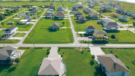 Long stretch of oceanfront residential development with low-density colorful raised beach houses, set apart by spacious grassy backyards, vacant land near sandy shoreline in Port Bolivar, Texas. USA