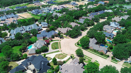 Cul-de-sac keyhole shape street in quite residential neighborhood upscale mansion houses with swimming pool, well-trimmed landscape in Coppell, Dallas suburbs DFW Metroplex, Texas, aerial view. USA