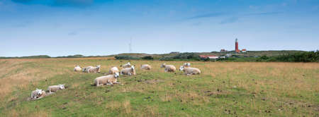 sheep in grass on dike near de cocksdorp and lighthouse on dutch island of texel in the netherlands