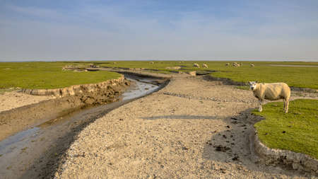 Sheep in Tidal marshland with natural meandering drainage system on wadden island of Ameland in Friesland, Netherlands