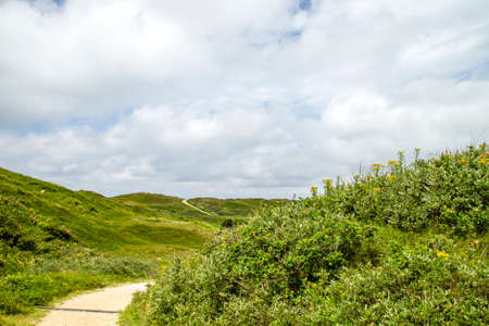 A beautiful sandy path along the ocean. Some clouds in the blue sky. North Holland dune reserve, Egmond aan Zee, Netherlands.