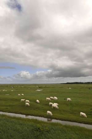 Sheep in Tidal Marshland nature reserve Verdronken land van Saeftinghe in Province of Zeeland. Netherlands