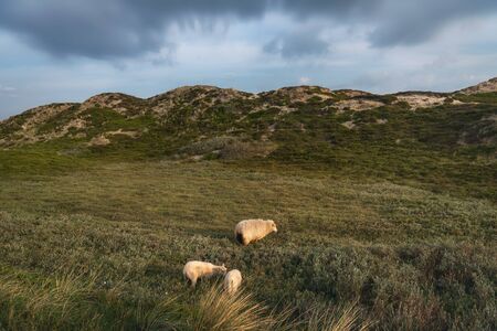 Rural landscape with a sheep and two lambs grazing on the dunes with moss and sand, on the Sylt island, Germany, in the sunrise light.