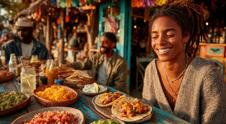 Festive mexican dinner with tacos and friends at outdoor party. That the image is generated using AI.