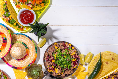 Carnival celebration of Cinco de Mayo showcases vibrant Mexican cuisine with colorful tacos, beans, and traditional elements in a festive atmosphere