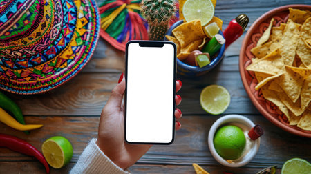 A white woman holds a cell phone with a white screen in her hand against the background of a table with Mexican symbols of the Cinco de Mayo celebration. View from above. Phone mockup. Online shopping for the holiday. Sombrero, nachos, lime, red pepper and cactus