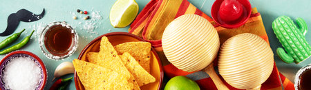 Cinco de Mayo Festive Setup with Nachos, Tequila, and Maracas