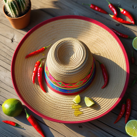 An inverted straw sombrero hat sits on a wooden table with red chili peppers and lime slices scattered around it.