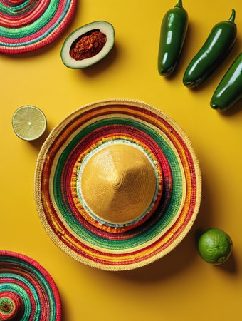 A vibrant flat lay featuring a traditional sombrero, colorful chilies, and cacti against bold backgrounds. Perfect for cultural or festive themes.