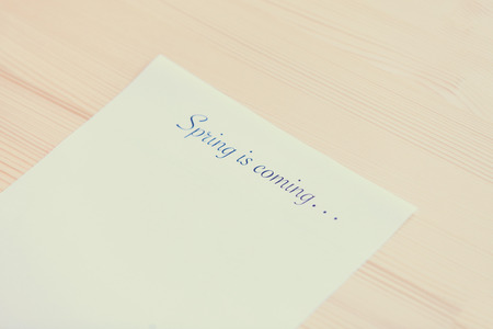 Paper with words Spring in coming on a wood background