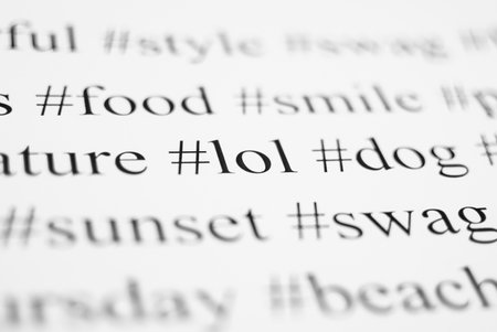 Closeup of typed popular hashtags. Words on the paper sheet. Abstract concept of social media, communication, social networking, digital society, and internet.