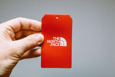 POV male hand holding etiquette sticker of The North Face paper documents backpack