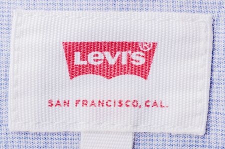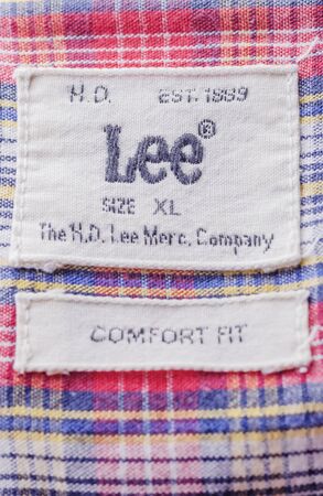 Closeup of Lee label on clothes. Lee is an American brand of denim jeans, first produced in 1889 in Salina, Kansas, USA.