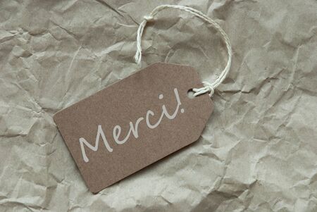 One Beige Label Or Tag With White Ribbon On Crumpled Paper Background With French Text Merci Means Thank You Vintage Or Retro Style