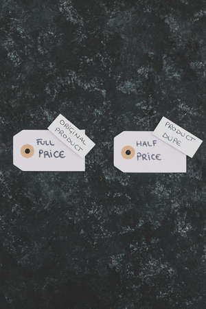 concept of imitations and unfair competition, half price vs full price tags with Original vs Dupe product labels