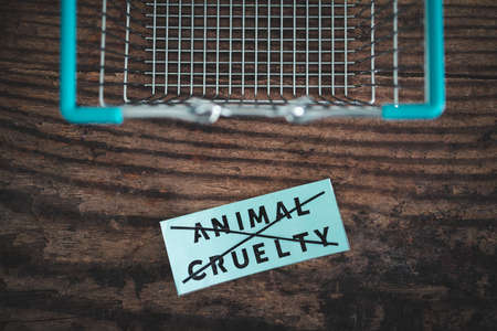Crossed out animal cruelty product label with grocery shopping basket, concept of healthy nutrition and ethical choices