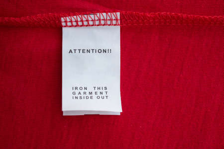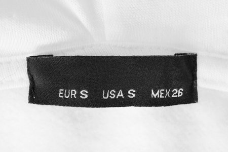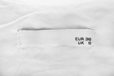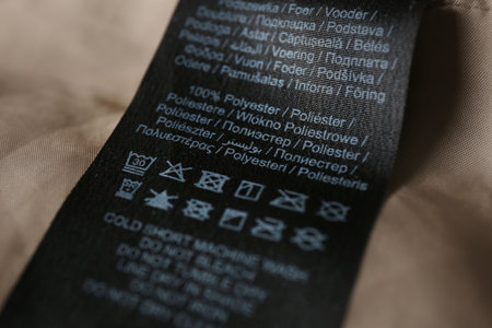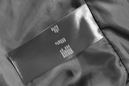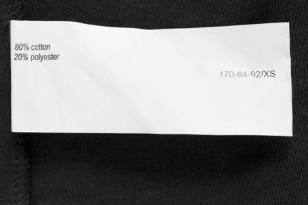 White label on clothing indicating the percentage of material content in the fabric. The composition of the fabric as a percentage. clothes label on black cotton fabric texture background.