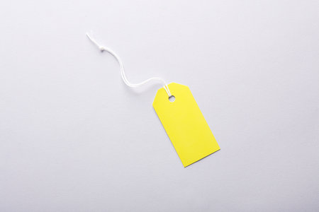 Yellow blank clothing price tag or label mockup with string on gray background. Sale, shopping concept. top view