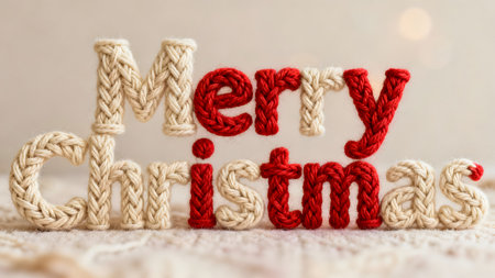A close-up, overhead shot shows the words Merry Christmas spelled out in thick, red yarn letters against a cream-colored, cable-knit sweater.