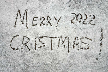 Inscription Happy New Year 2022 and Marry Christmas on natural snowy surface in wintertime. Text, winter holiday background with copy space on snow. hand writing, text,