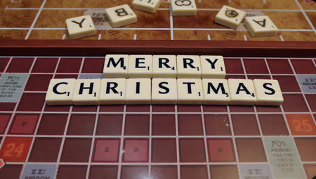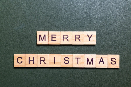 Merry Christmas text made of wooden letter blocks on green background, warm festive holiday greeting concept