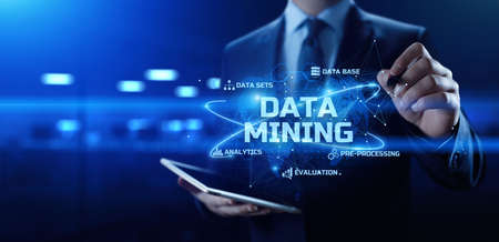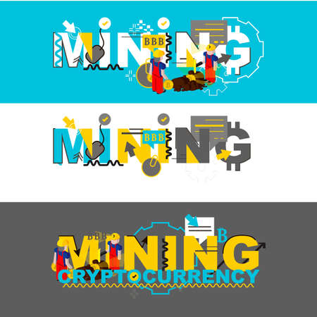 Virtual currency text composition MINING with set of signs around text on flat style vector illustration