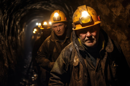 This illustration employs a dramatic and gritty style, ideal for enhancing the visual impact of safety training materials, mining industry publications, or adventure-themed designs. The use of earthy tones and rugged textures adds authenticity to the scene. Perfect for professionals in the mining sector looking for impactful visuals. AI-generated illustration.