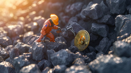 Construction site with miniature workers cryptocurrency mining Bitcoin