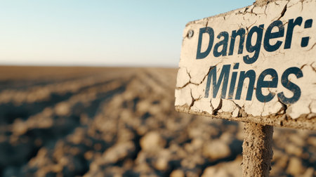 Cracked lettering on a warning sign cautions against mines in an arid field, capturing the haunting beauty and peril of abandoned battle zones under a clear sky.