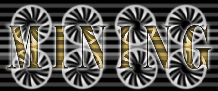 FPGA mining. The inscription has a texture of the photography, which depicts several silver bitcoins.