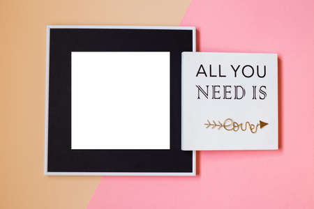 White picture frame with decorations. Mock up for your photo or text. Place your work, print art, white background, pastel color book. Photo realistic 3d illustration. Pink and orange background