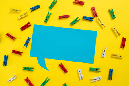 Colorful Pegs Placed Around Speech Bubble With Important Information. Wooden Clips Arranged All Over Dialogue Ballon With Crutial Idea. Pins With Critical Data Inside.