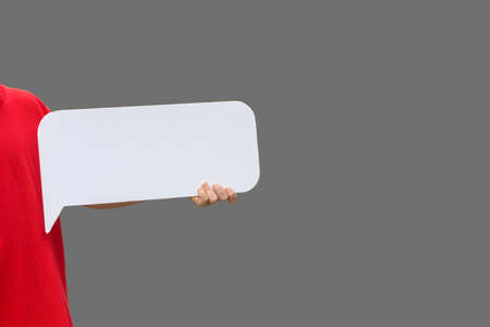 unknown man in red T-shirt holds empty blank white sheet or signboard on gray background