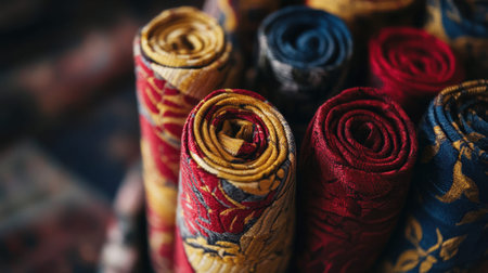 Explore a captivating arrangement of colorful rolled fabrics showcasing intricate patterns and rich textures, perfect for creative projects and inspiration.