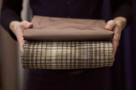 Man holds folded stack of brown and tweed textile cloth in atelier or drapery store. Gift for tailor or dressmaker. Seamstress greeting holiday concept. High quality photo