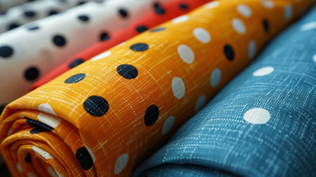 Rolled up fabric swatches in various colors with polka dots. Close-up view of colorful, patterned fabric rolls.