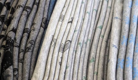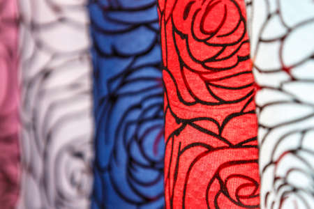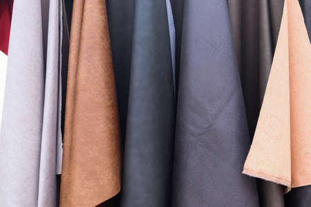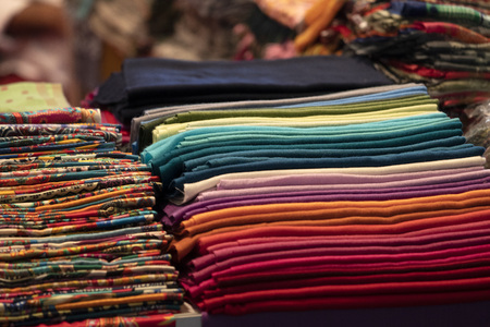 Detailed close up view on samples of cloth and fabrics in different colors found at a fabrics market.