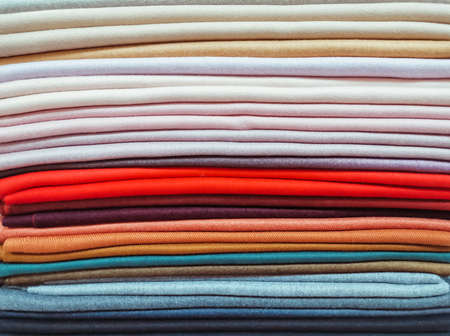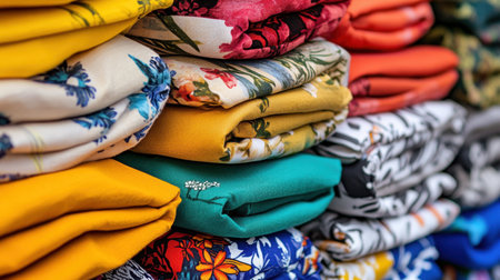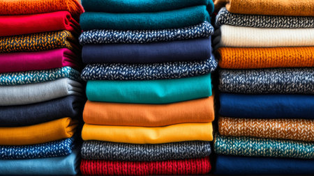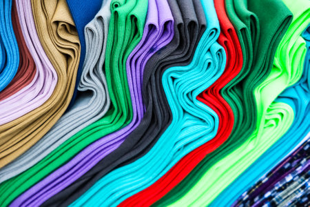 Folded colorful clothes are creating a wavy pattern, showcasing a vibrant and diverse selection of fabrics